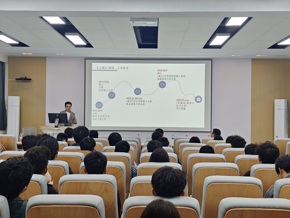 讲座期间,邓博士介绍个人成长与求学经历,分享了其博士论文“预应力玻璃”的研究背景、核心内容与研究成果,详细介绍了华工科技的企业发展概况、核心业务,以及自己在该企业担任的相关职务与主要工作内容。作为深耕力学领域的资深研究者,邓博士长期从事结构轻量化与力学分析、结构连接技术及智能记忆金属(如Fe-SMA)应用等前沿研究,其分享兼具专业性与实用性,让在场学子对专业应用与行业发展有了更清晰的认知。